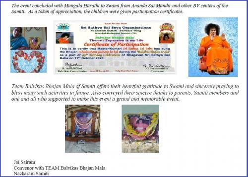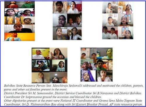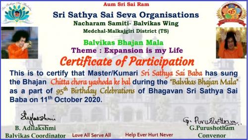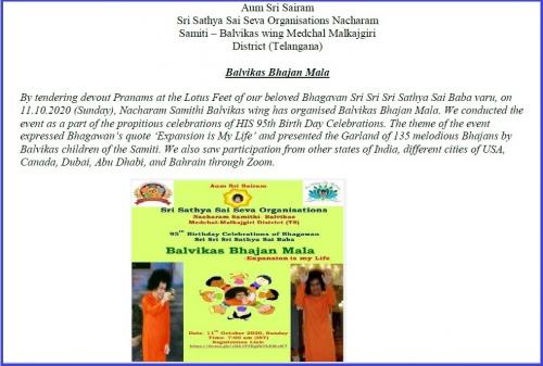 On the auspicious occasion of 95th Birthday celebrations of our beloved Bhagawan Sri Sri Sri Sathya Sai Baba varu, Nacharam Samithi Balvikas had organised online Balvikas Bhajan Mala on 11.10.2020, Sunday, with 135 children from India and other countries.