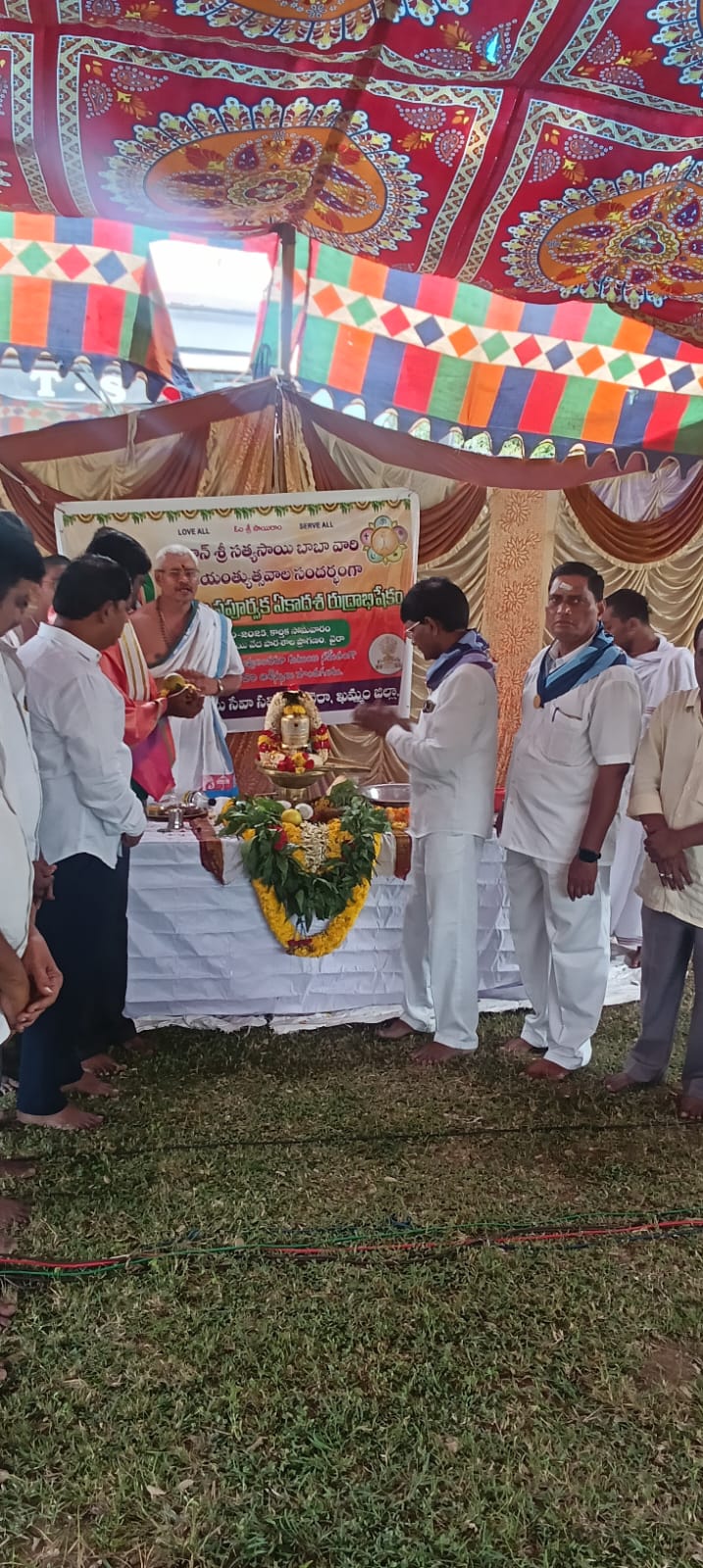 🌻ఓం శ్రీ సాయిరాం🌻 శ్రీ సత్య సాయి సేవా సంస్థలు ఖమ్మం జిల్లా 🌻🌻 భగవాన్ శ్రీ సత్యసాయి బాబా వారి దివ్య అనుగ్రహ ఆశీస్సులతో.... స్వామి వారి శత జయంతి ఉత్సవాలు పురస్కరించుకుని వైరా సమితి వైరా శ్రీ సత్యసాయి వేదపాఠశాల ప్రాంగణం లో 27/10/2025 కార్తీక సోమవారం ఉదయం 9- 00 గంటలకు గోపూజ మరియు 9- 30 గంటల నుండి మహన్యాస పూర్వక ఏకాదశ రుద్రాభిషేకాలు శ్రీ సత్యసాయి వేదపాఠశాల వైరా వేద పండితుల చే, వేద విద్యార్థులచే వైభవంగా నిర్వహించబడినవి. ఈ కార్యక్రమంలో జిల్లా అధ్యక్షులు, జిల్లా కార్యవర్గ సభ్యులు, మార్కెట్ కమిటీ చైర్మన్ గారు తదితర పలువురు ప్రముఖులు, భక్తులు పాల్గొన్నారు.. సాయిరాం🙏 జిల్లా ఆఫీస్ ఇంఛార్జి శ్రీ సత్యసాయి సేవా సమితి వైరా, ఖమ్మం జిల్లా